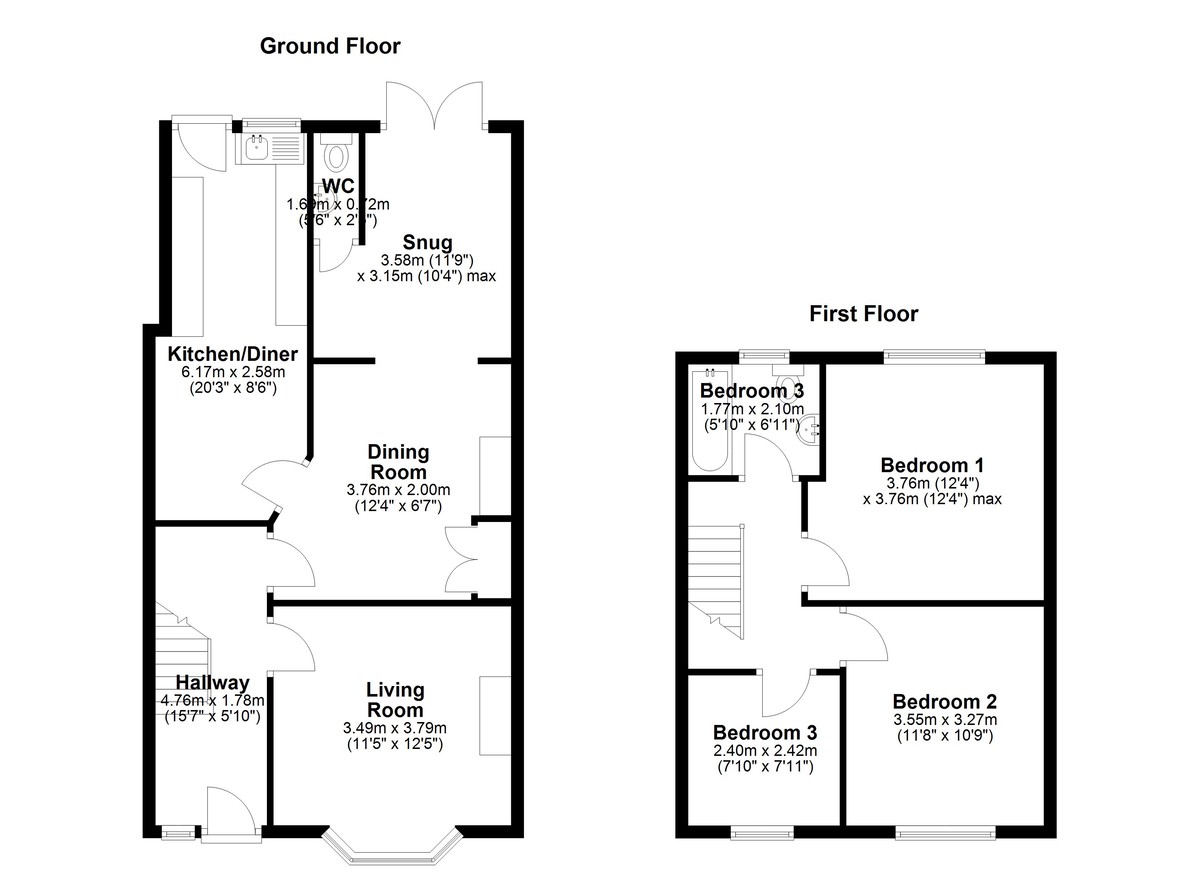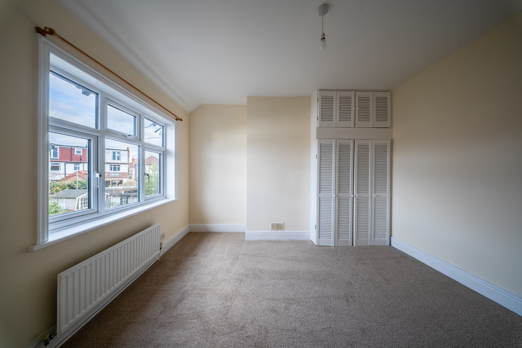 To the first floor, the main bedroom overlooks the rear garden and benefits from a fitted cupboard, offering practical storage. A generous double bedroom is positioned to the front, alongside a versatile third bedroom which would make an ideal single room, nursery, or home office. These rooms are served by a well-appointed three-piece family bathroom comprising a bath with shower over, WC, and wash basin.