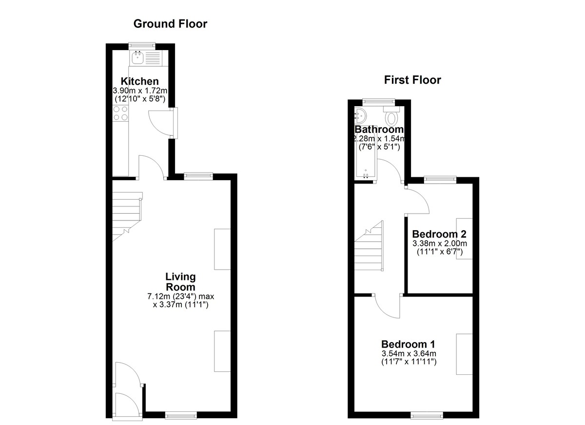 A spindled staircase leads up to the first floor. To the front of the property is the principal bedroom, a fantastic-sized double room. The second bedroom overlooks the rear and is also a double. Both bedrooms are served by a three-piece bathroom suite, comprising a bath with shower above, WC, and sink.