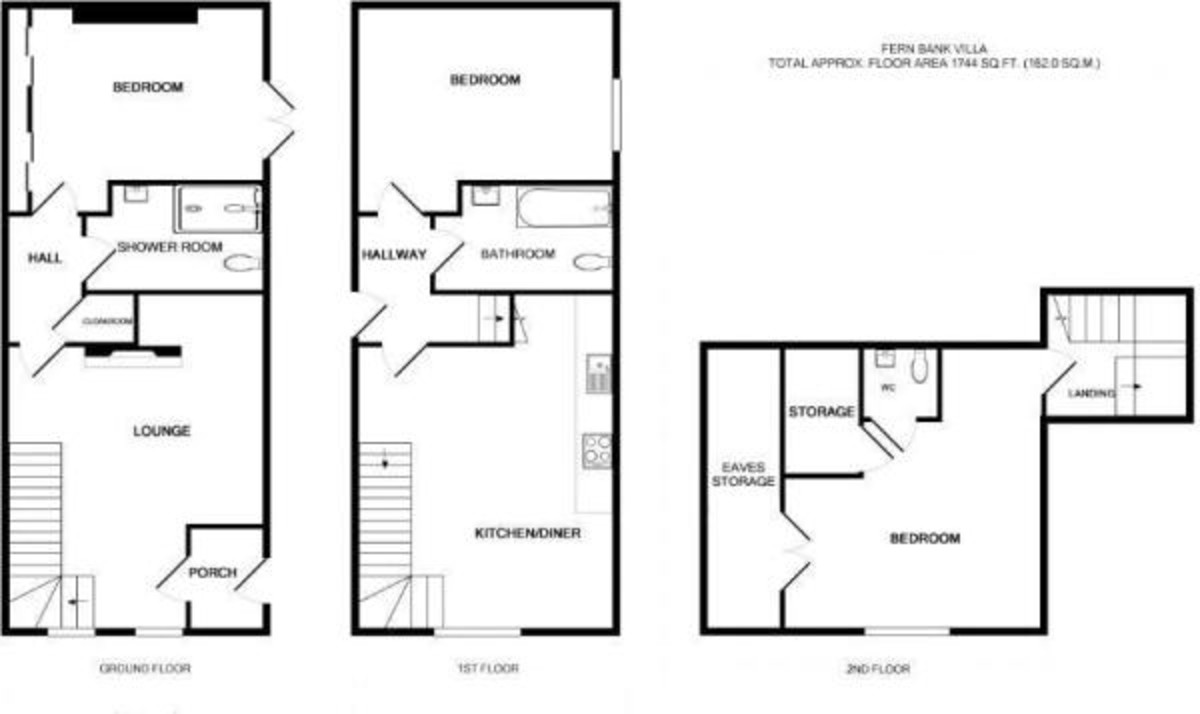 The first floor comprises a large open-plan kitchen and dining area, a second family bathroom, and a double bedroom.