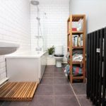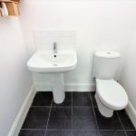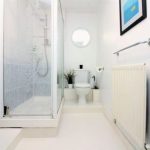 Part tiled walls, comprising a three-piece suite with low-level WC, pedestal wash basin, and walk-in shower cubicle with electric shower. Radiator.
