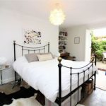 Cast iron radiator and double French doors with plantation shutters leading to the side garden.