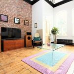 Two cast iron radiators, two sash windows with plantation shutters, exposed brick feature wall, TV point, understairs storage cupboard, and stairs rising to the first floor.