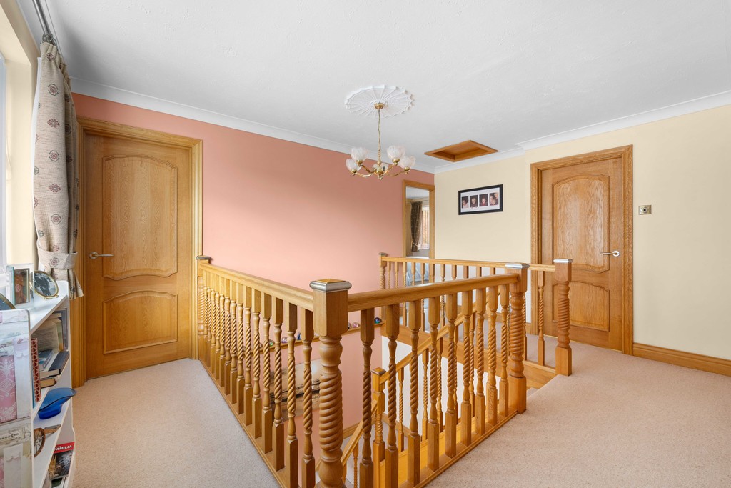 On entering, you are greeted by a full-height hallway with a gallery landing that sets the tone for the space and light found throughout the property. The ground floor offers a generous lounge, a separate study, a well-appointed kitchen/dining room with adjoining utility room, a convenient WC, and a stunning conservatory. The conservatory has been upgraded with an insulated roof, making it an inviting space to enjoy all year round. From here, you can take in lovely views over the private rear garden and open fields beyond.