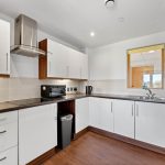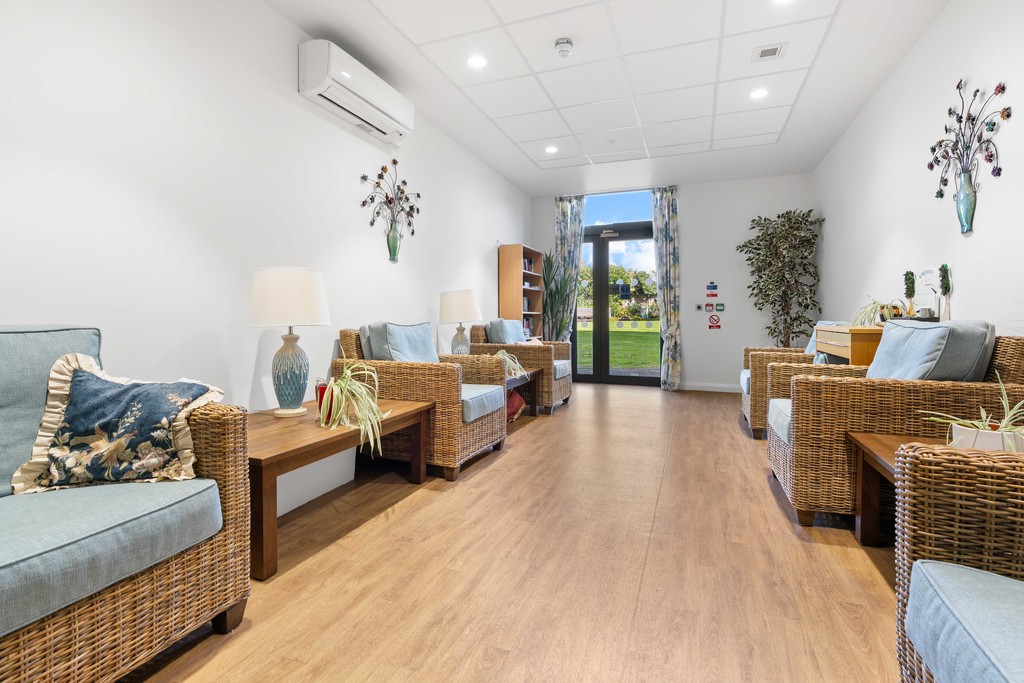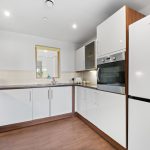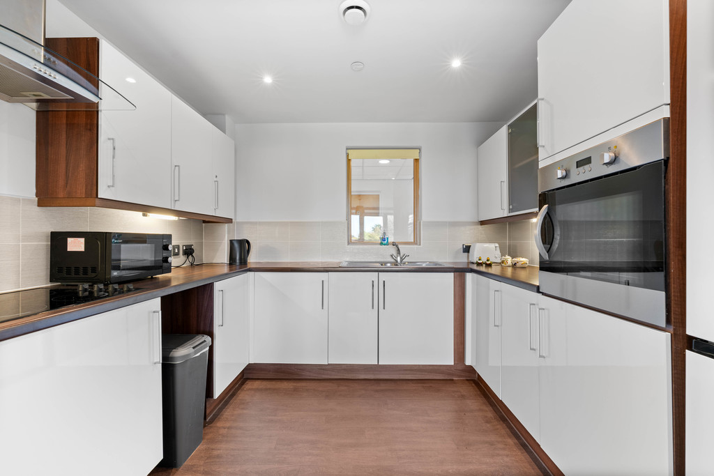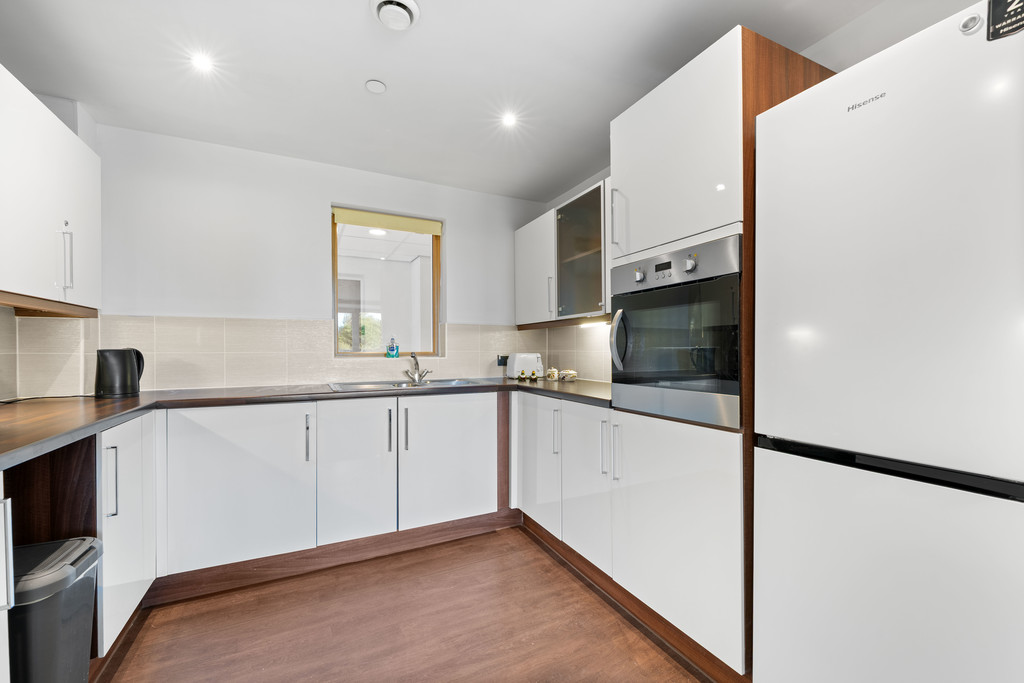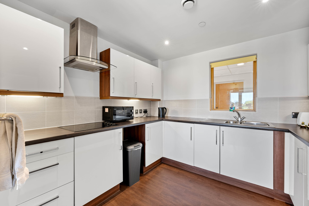 The apartment itself has a particularly welcoming feel. The entrance hall is spacious, with two useful storage cupboards and a secure entry system. The living room is the real highlight - larger than many similar retirement apartments - and includes a recessed sitting area that frames the garden views perfectly. The kitchen is open to the living space and comes with timber-effect units, an oven and hob, and has plumbing ready for a dishwasher plus space for further appliances.