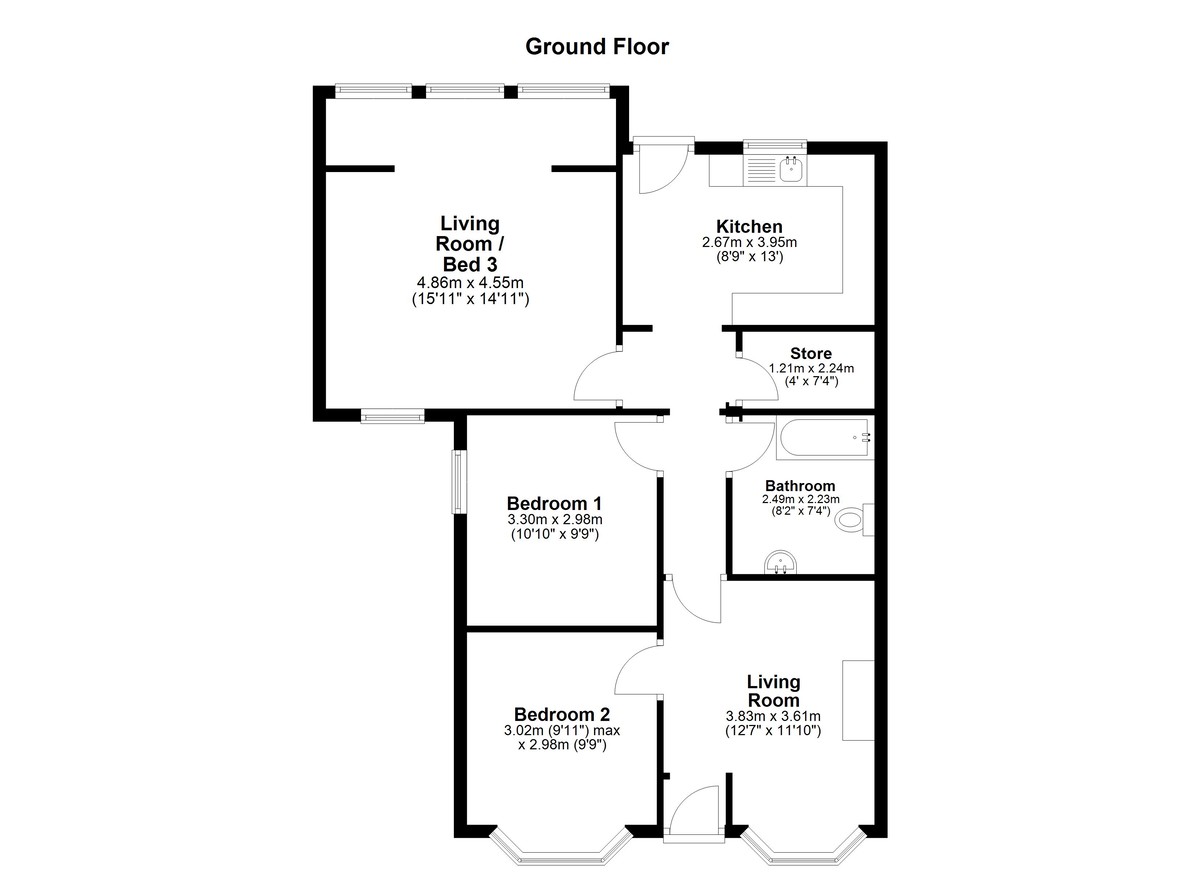 Inside, the property offers versatile accommodation throughout. A welcoming entrance leads to a bright sitting room with a feature bay window, complemented by a bay-fronted double bedroom to the front. The inner hallway provides access to a further bedroom, a bathroom fitted with a white three-piece suite, a well-equipped kitchen with fitted units and work surfaces, and a generously sized living/dining room to the rear-perfect for everyday living and entertaining alike.