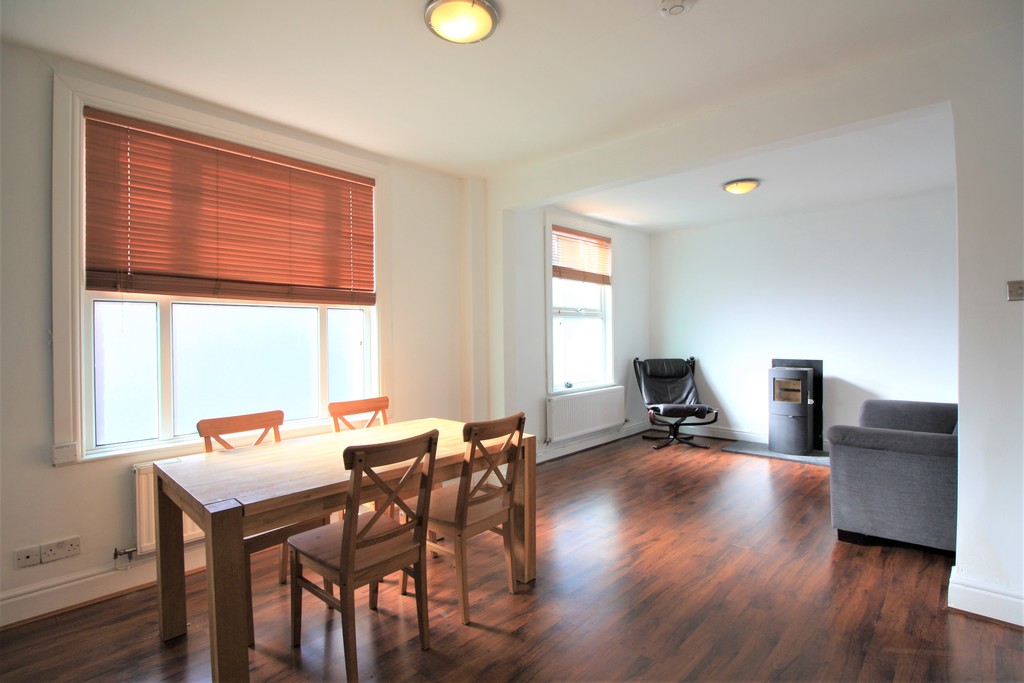 Entrance hall with a large under stairs cupboard. An open plan lounge and dining room to the front of the house, furnished with: a sofa, armchair, dining table with four chairs and a log burner which is perfect for those cold winter months. A fully fitted shaker style kitchen with fridge freezer, gas hob, extractor and electric oven and washing machine.