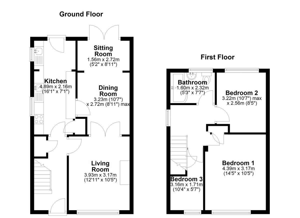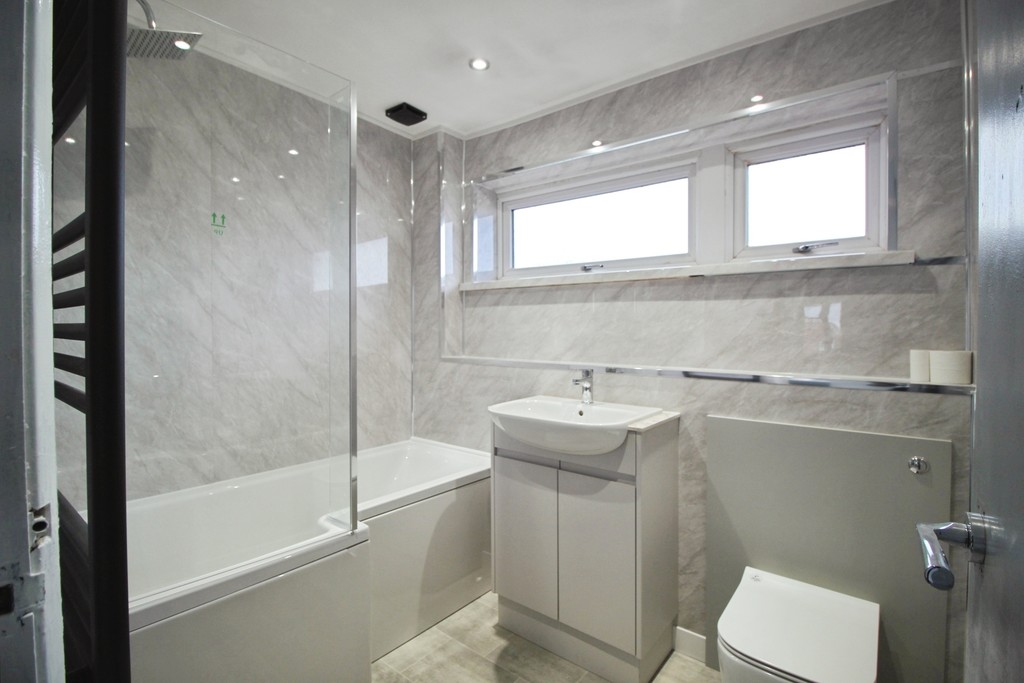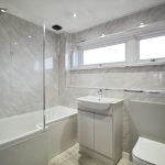 Upstairs, the first floor boasts two generous double bedrooms, a well-proportioned third bedroom, and a stylish family bathroom. The bathroom is fitted with a contemporary P-shaped bath with shower over, WC and wash basin, finished to a high standard.