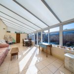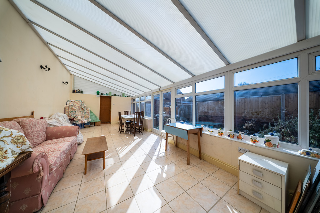 The property also benefits from a large dining kitchen fitted with a range of kitchen cupboards and appliances, offering ample space for family dining. To the rear is a useful storage room, which could easily be utilised as a study or home office, along with a downstairs WC with wash basin. A large conservatory with French doors opens onto the courtyard, providing further living space and a pleasant outlook to the rear.