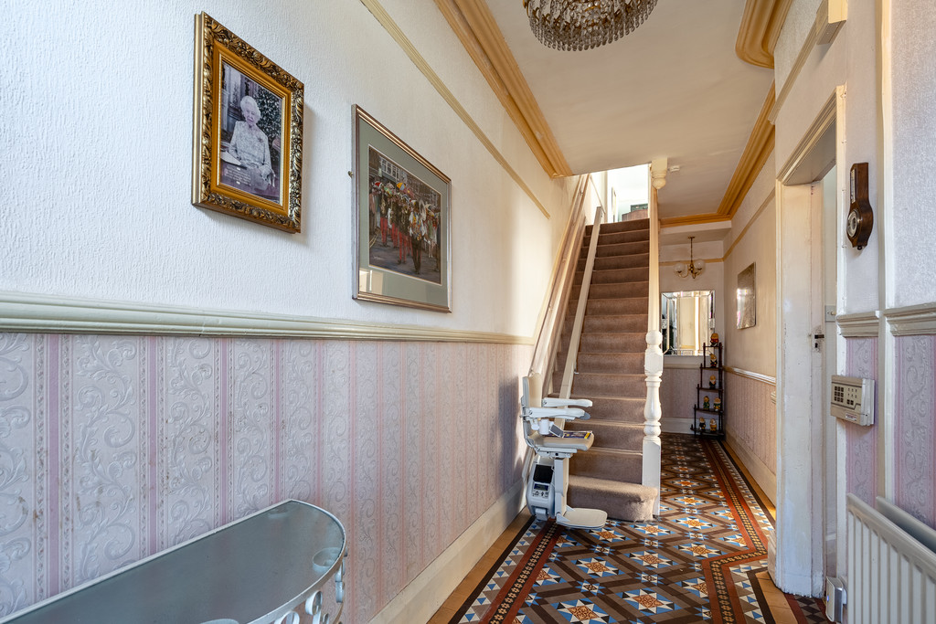 The property is entered via an impressive entrance hall featuring original Minton tiled flooring, high ceilings and ornate coving, immediately showcasing the character and heritage of this Edwardian home.