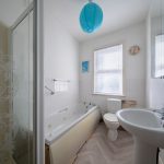A striking original Edwardian staircase leads to the first floor. The principal bedroom spans the full width of the property and features a large bay window, creating a light and spacious main bedroom. The second bedroom is a generous double with two windows, while the third bedroom is also a double overlooking the rear courtyard. The family bathroom comprises a four-piece suite including bath, separate shower, WC and wash basin.