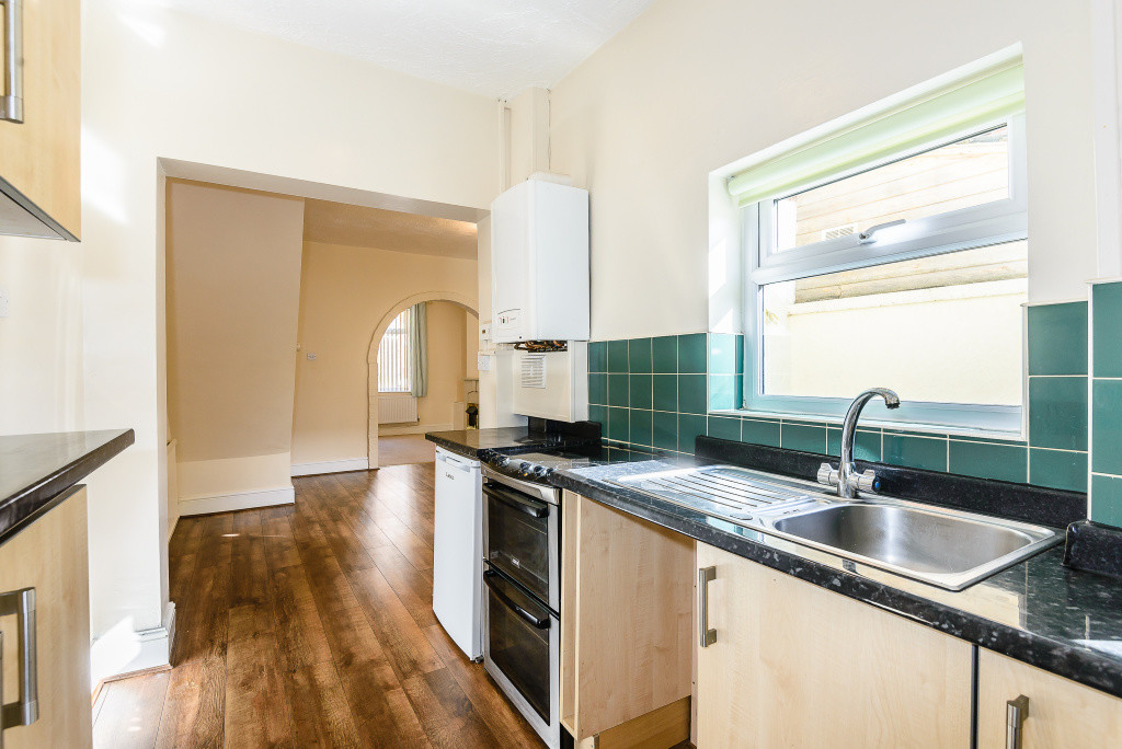 The ground floor comprises two reception rooms, providing flexible living and dining space. To the rear is a fitted kitchen with a range of wall and base units offering ample storage and workspace, with access to the rear courtyard.