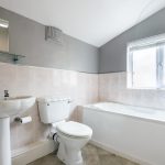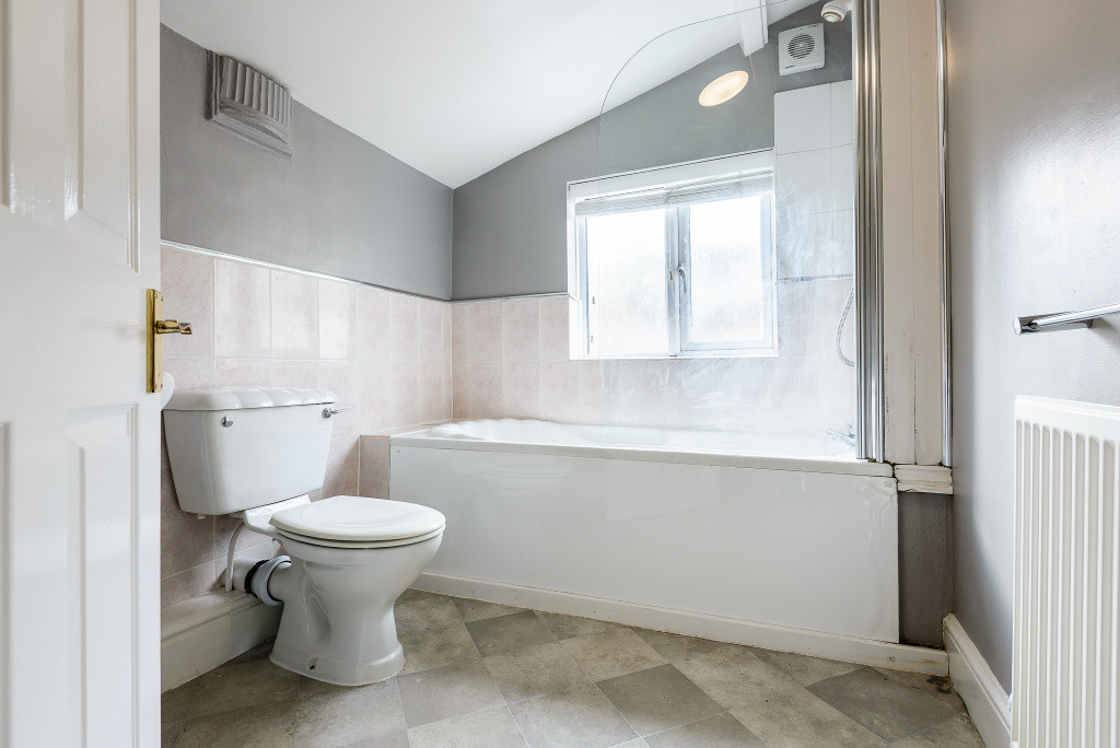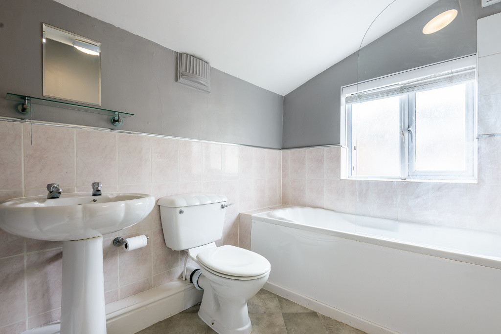 To the first floor are two generous double bedrooms. The main bedroom spans the full width of the property, creating a bright and spacious principal room. The second bedroom is also a comfortable double. The bathroom features a three-piece suite comprising a bath with shower over, WC and wash hand basin.