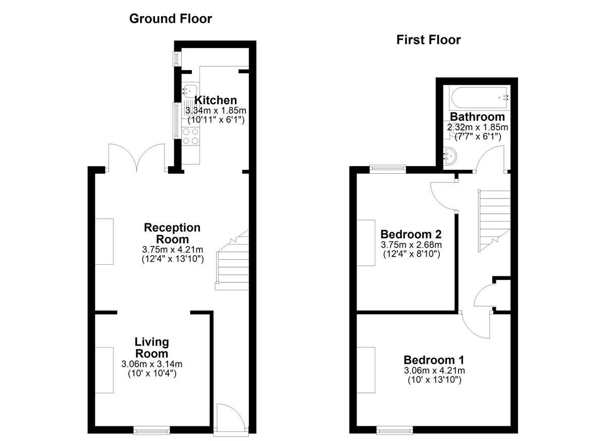 To the first floor are two generous double bedrooms. The main bedroom spans the full width of the property, creating a bright and spacious principal room. The second bedroom is also a comfortable double. The bathroom features a three-piece suite comprising a bath with shower over, WC and wash hand basin.