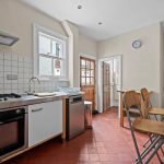 To the rear is a versatile second reception room or dining room, ideal for entertaining or family living, complete with a quarry tiled floor and ample space for a dining table. This leads through to the kitchen, which is fitted with a gas hob, electric oven, and provides spaces for a dishwasher and fridge. Beyond the kitchen is a separate utility room offering additional practicality with space for both a washing machine and dryer.