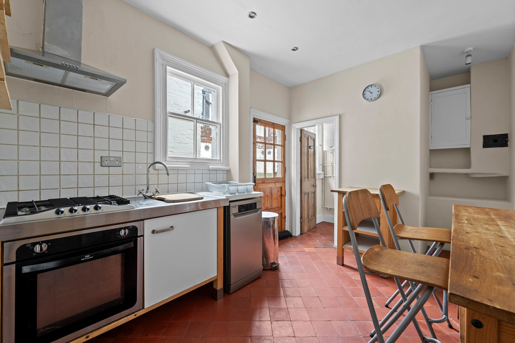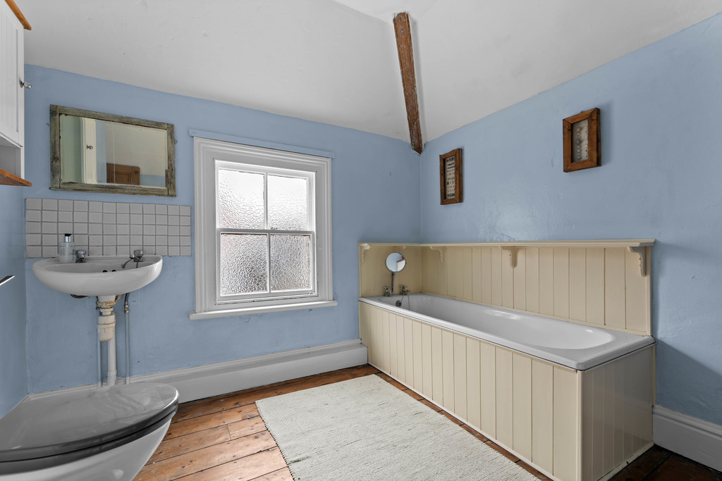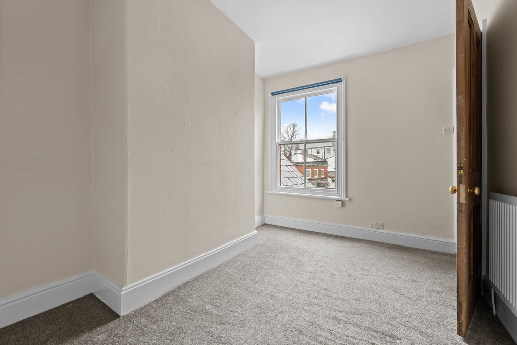 Stairs rise to the first floor where the main bedroom is positioned at the front of the house. This is a particularly generous double room, retaining original floorboards and another cast iron fireplace, adding to the home's period appeal. The second bedroom is also a good-sized double, making the property well suited to couples, small families or those needing home office space.