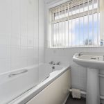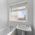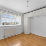 Upstairs, the property offers two double bedrooms, a family bathroom with bath, sink, and electric shower, along with a separate WC. A useful storage room is also located on this floor. Flooring is finished with laminate and vinyl to the ground floor, and carpet to the first floor. Large windows throughout allow natural light to fill the home, creating a bright and inviting atmosphere.